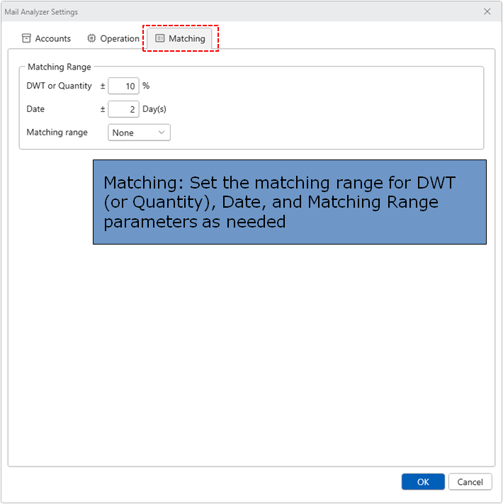 4. Setting: Configure your Mail Account, Operation, and Matching Information.