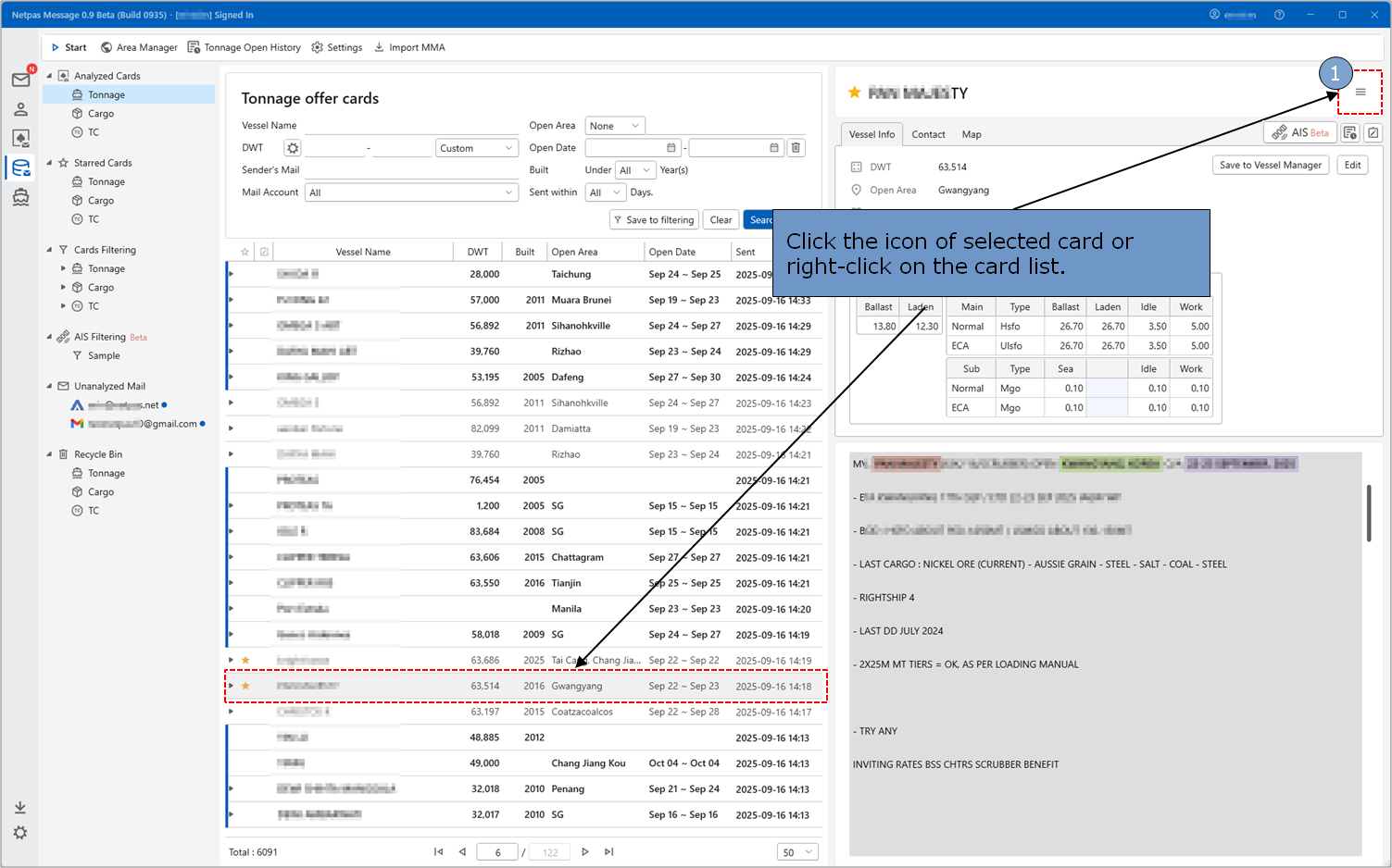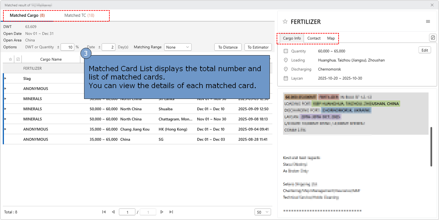 It displays matched Cargo cards for Tonnage/TC cards, and matched Tonnage/TC cards for Cargo cards automatically.