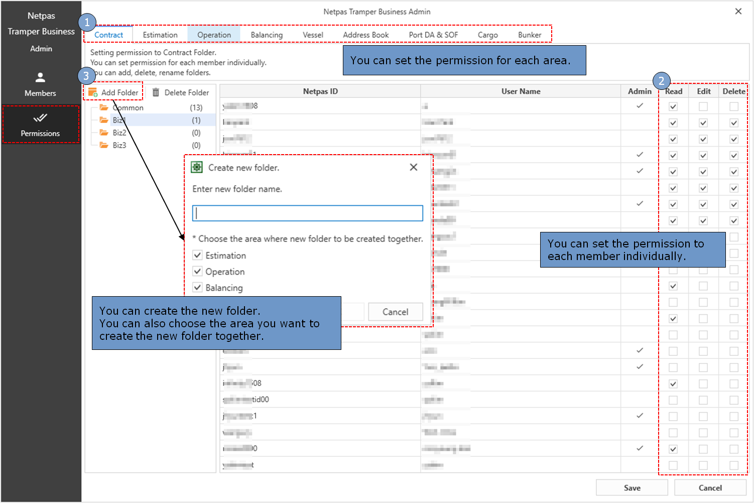 You can set the permission for each folder and each members individually in each area.