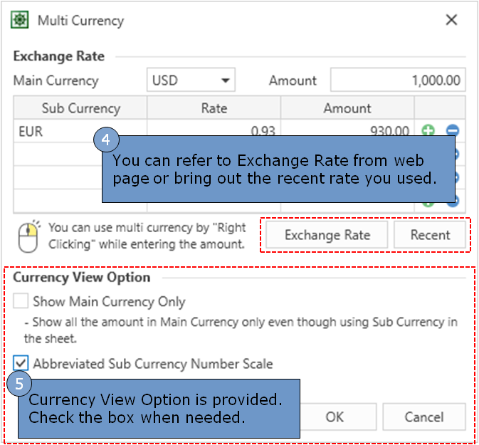 In order to use the Multi Currency, you need to choose the name of sub currency and input the exchange rate.